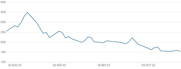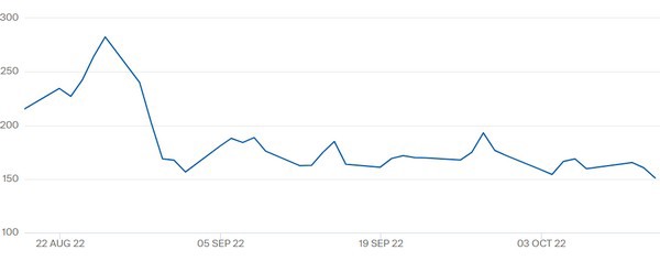 De gasprijs voor november 2022 vanochtend om 11.30u. Op dat moment lag de prijs met 146,6 euro per megawattuur zo'n 4,6 procent onder het prijsniveau waarop de markt gisteren afsloot. Bekijk hier de actuele cijfers.