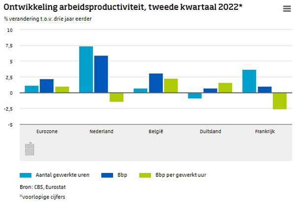 De arbeidsproductiviteit in Nederland was in het tweede kwartaal van 2022 1,4 procent lager dan in het tweede kwartaal van 2019. In België en Duitsland was deze juist respectievelijk 2,3 en 1,6 procent hoger dan in het tweede kwartaal van 2019. In Frankrijk is de arbeidsproductiviteit 2,6 procent gedaald in dezelfde periode. Dit blijkt uit een analyse van het CBS.