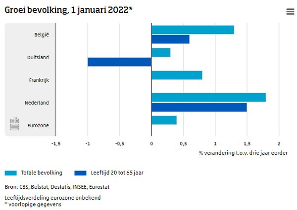 Dat het aantal gewerkte uren in Nederland sterker steeg dan in de omliggende landen, hangt onder meer samen met een grotere bevolkingsgroei. Op 1 januari 2022 was de Nederlandse bevolking met 1,8 procent gegroeid ten opzichte van drie jaar eerder. In België, Duitsland en Frankrijk lagen deze percentages lager. Ook het aantal 20- tot 65-jarigen – de leeftijdscategorie waarin veel mensen werken – groeide in Nederland sterker dan in omliggende landen. In Duitsland en Frankrijk nam het aantal 20- tot 65-jarigen zelfs af door vergrijzing.