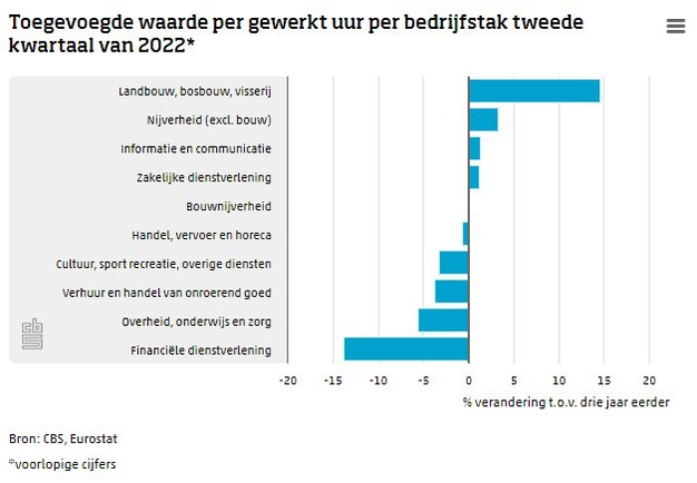 Ook de bedrijfstak landbouw valt op. Door een afname van het aantal gewerkte uren met 11,7 procent en een toename van de toegevoegde waarde van 1,2 procent, is de productiviteit met 14,6 procent toegenomen.