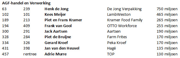 Binnen de AGF-handel verwerking en toeleveranciers zien we een toppositie voor Henk de Jong van De Jong Verpakking. Werd zijn vermogen vier jaar geleden nog op 65 miljoen geschaard, na het overnamebod van de Finse branchegenoot Stora Enso komt de Quote-redactie uit op 750 miljoen euro. "We hebben inderdaad ons best gedaan en de zaken lopen als een tierelier", laat de voormalig ijsbergslateler aan de Quote-redactie weten. Wel houdt hij een slag om de arm. "Als de deal rond komt dan hebben we goed geboerd, maar de definitieve handtekeningen zijn nog niet gezet."