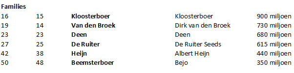 In de aparte Familie top-50 een topnotering voor de gebroerders Kloosterboer die hun koel- en vrieshuizen verkochten aan Lineage. Of Klaas, Jack, Johan en Alex Kloosterboer er inderdaad 1 miljard euro voor vingen, is door een gebrek aan jaarstukken volgens Quote in ijzige nevelen gehuld. Ook hier zien we de zaadveredelaars en retailers weer op de lijst terugkomen. Het kan maar duidelijk zijn waar het geld verdiend wordt.