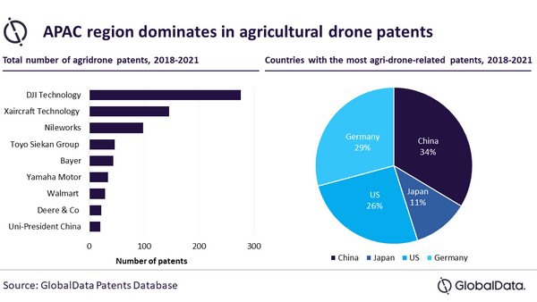 "De Chinese drone-industrie is de grootste ter wereld en het land leidt de innovatie in tuinbouwdrones. De Chinese bedrijven DJI en XAG zijn daarin pioniers. Deze drones zorgen voor beeldvorming en landmetingen, terwijl gewasbesproeiing en terreinbewaking belangrijke groeigebieden worden. Beide bedrijven hebben de meeste octrooiaanvragen gedaan in de agri-drone-sector. Tussen 2018 en 2021 publiceerden ze 421 octrooien, wat China's dominante positie in de wereldwijde drone-industrie versterkt."
