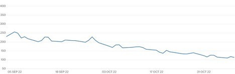 Geen nieuws is goed nieuws, maar niet als het een euro is. De prijs van daggas pingpongde in de afgelopen week van het oude (28 cent) naar het nieuwe (eurootje+) normaal, maar ligt gemiddeld op 1,10-1,20. De trend is weliswaar voorzichtig dalende maar ligt voor iedereen behalve allicht een handjevol buitverdelers nog altijd onbegrijpelijk hoog. Voorraden zitten vol, het wil maar niet koud worden, schepen vol LNG dobberen voor de Europese kusten (zie update AgroEnergy) en dat is in een notendop voor nu de status quo.