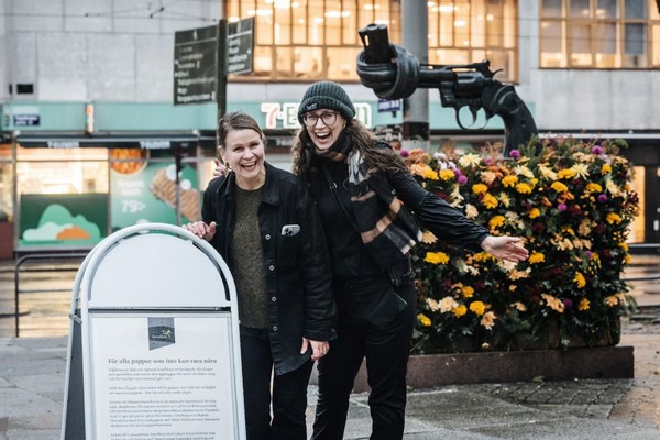 Een bijzondere actie van Interflora Sweden. Komende zondag viert men er Vaderdag, en om al die vaders wereldwijd te herdenken die er wegens oorlog en geweld niet bij kunnen zijn heeft de online boekettenverkoper in drie verschillende steden het beeld Non-Violence, ook wel The Knotted Gun genoemd (wiki) met bloemen versierd. De bekende Zweedse bloemisten Sara-Lisa Ludvigsson en Heidi Mikkonen namen het beeld in Gothenberg voor hun rekening, de andere twee beelden staan in Stockholm en Malmö.