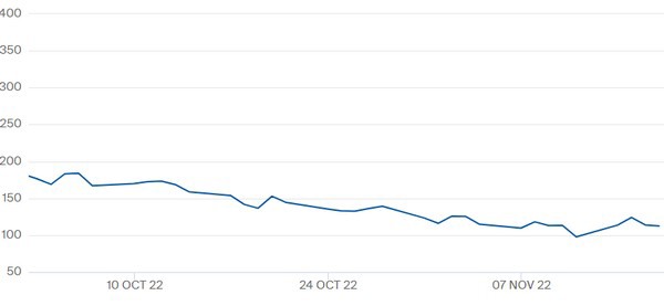 De daggasprijzen zijn flink gestegen sinds de start van november. De 'Day Ahead-gasprijs' op de TTF is met kleine pieken en dalen tot boven de 100 euro per megawattuur gestegen. Vrijdagochtend lag de prijs op ruim 110 euro. Bíjna net zo hoog als de termijnprijs voor december. Voor de eerste maanden van 2023 ligt de termijnprijs boven de 120 euro.