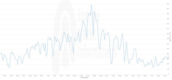 De hogere daggasprijs voor de afgelopen dagen vertaalde zich ook in de EPEX-spotprijzen, stipt AgroEnergy aan. Voor het eerste sinds 14 oktober (toen daggas ook rond de 100 €ct/m3 handelde), was er weer een uurprijs van 300 €/MWh. Men constateert dat in de afgelopen maand de EPEX spotprijzen dus op 'een beduidend lager niveau' lagen 'als gevolg van de gedaalde daggasprijs.' De EPEX-baseloadprijs lag vrijdagochtend net onder de 190 euro.