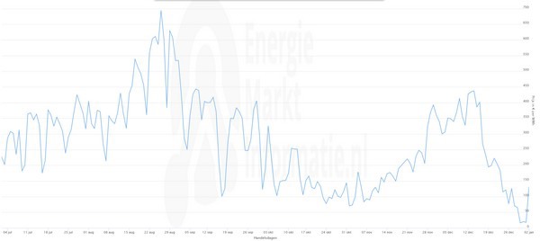Als we ook nog even een korte blik op de elektriciteitsprijzen werpen, dan valt op dat ook die flink gezakt zijn. Op 30, 31 december en 1 januari lagen de APX day ahead-prijzen zelfs rond de 20 euro per megawattuur. Vandaag, 2 januari, liggen de prijzen voor de basisuren op net iets meer dan 131 euro per megawattuur. De BELPEX-prijzen liggen day ahead op ruim 125 euro.