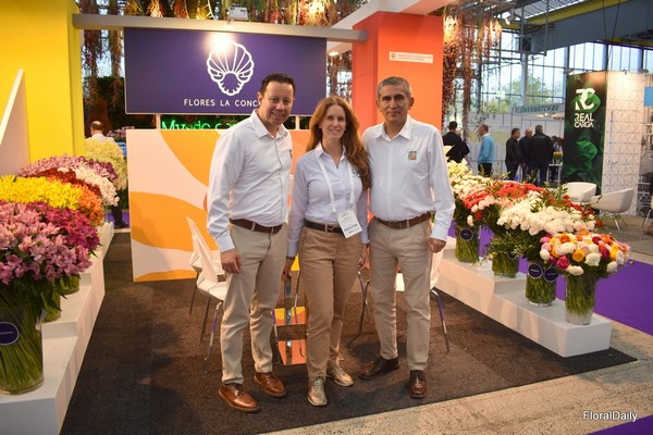 Tatiana de Germán-Ribón (midden) met Alain Jiménez (links) en Sergio Illescas Jijón (rechts) van Floreloy, een zusterbedrijf van Flores La Conchita in Ecuador op de IFTF in Vijfhuizen.