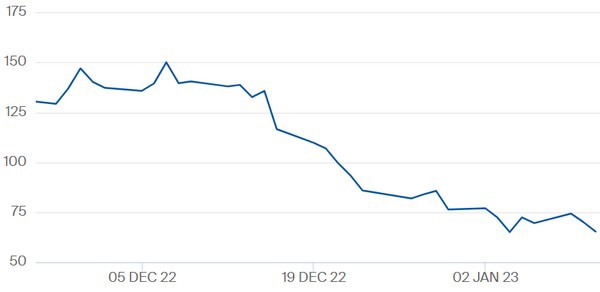 De TTF-gasprijs voor februari 2023 t/m 11 januari. Donderdagochtend 12 januari ligt de gasprijs op 67 euro per megawattuur. Klik hier voor actuele cijfers.