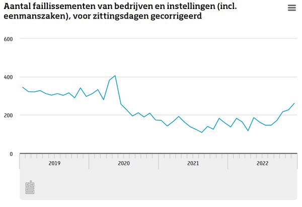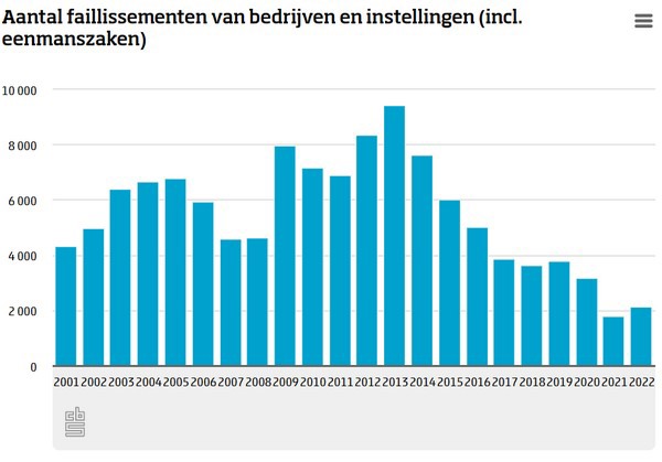 In 2022 zijn 2.144 bedrijven en instellingen, inclusief eenmanszaken, failliet verklaard. Dat is het op een na laagste aantal sinds de start van de statistiek in 1981. Bedrijven konden in het begin van 2022 nog gebruik maken van coronasteunmaatregelen. In vergelijking met 2021 lag het aantal faillissementen 18 procent hoger. Toen bedroeg het aantal faillissementen 1.818. De piek in het aantal faillissementen, van 9.431, werd tijdens de eurocrisis in 2013 bereikt.