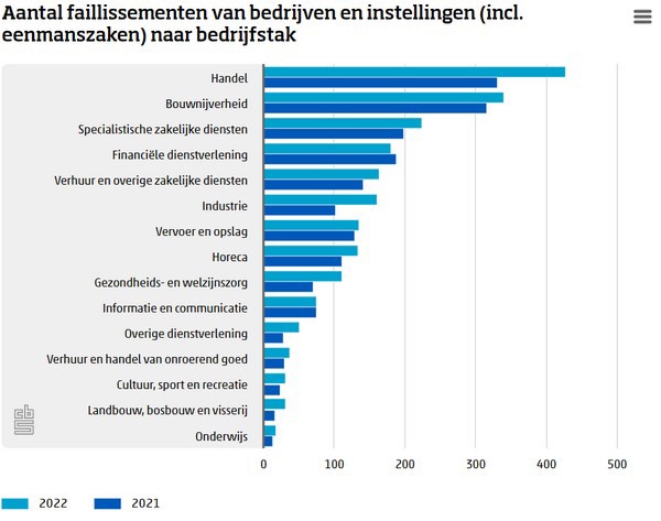 Net als in voorgaande jaren had de handel, met 428, de meeste faillissementen in 2022. Daarna volgde de bouwnijverheid met 341. Beide bedrijfstakken behoren qua aantal bedrijven tot de grote bedrijfstakken.