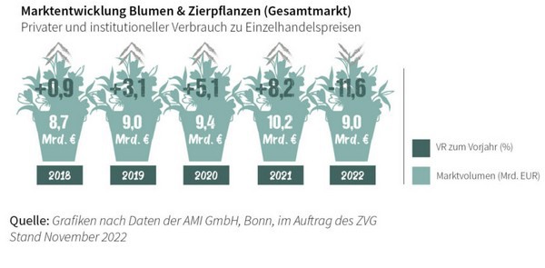 De Duitse bloemen- en plantenmarkt heeft in 2022 9 miljard euro omgezet. Per hoofd van de bevolking werd er voor 107 euro aan bloemen en planten uitgegeven in 2022. Dat is 1 euro minder dan in 2019, het laatste jaar voordat corona uitbrak. Het verschil wordt verklaard door bevolkingsgroei.