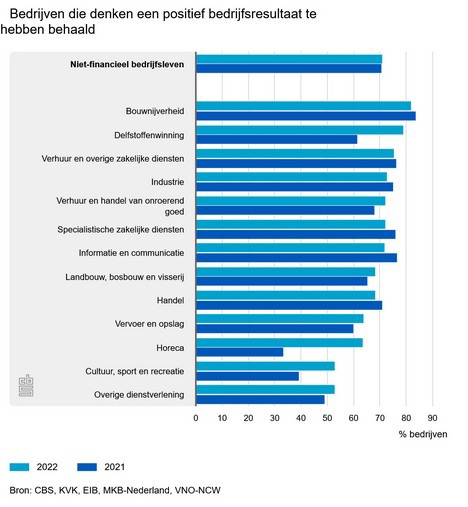 Iets meer dan 71 procent van de ondernemers denkt een positief bedrijfsresultaat te hebben geboekt voor 2022. Dat is bijna evenveel als een jaar geleden, toen bijna 71 procent van de ondernemers dit dacht voor 2021. Binnen het midden- en kleinbedrijf (mkb) denken ondernemers iets vaker een verlies of geen noemenswaardige winst te hebben gemaakt voor 2022 dan binnen het grootbedrijf. Voor de landbouw geldt dat het percentage is gestegen van 65,5% naar 68,5%.