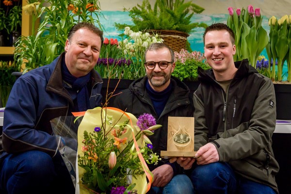 De Gouden Bolbloem is dit jaar gewonnen door De Goede Bloembollen met de combinatie Iris Reticulata ‘J.S. Dijt’, Corydalis ‘Beth Evens’ en Frittelaria Meleagris ‘Alba’. Burgemeester Rian van Dam van gemeente Hollands Kroon reikte de prestigieuze prijs als vanouds uit. Met lof van de jury blonk de inzending van De Goede uit in kwaliteit en uniformiteit. “We zijn zeer verrast. Wij doen al heel lang mee, maar kwamen niet altijd in aanmerking voor het winnen van de Gouden Bolbloem zonder een narcis en tulp. De opzet is iets gewijzigd en om dan te winnen is natuurlijk heel erg leuk,” aldus een trotse vader en zoon De Goede.
