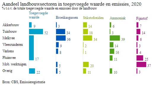 In 2020 bedroeg de toegevoegde waarde van de landbouw 1 procent van het bruto binnenlands product (bbp). In 1995 was dit nog 3 procent. De bijdrage van landbouw aan emissies is relatief groot. Dit geldt vooral voor de emissie van stikstof die in de vorm van ammoniak in de lucht terechtkomt. In 2020 was de landbouw verantwoordelijk voor ruim 80 procent van de totale ammoniakuitstoot door Nederlandse bedrijven en huishoudens. In 1995 was dit 91 procent. De landbouw stootte zowel in 1995 als in 2020 12 procent van de broeikasgassen uit. De bijdrage van de landbouw aan de uitstoot van fijnstof is 7 procent, maar was in 1995 nog lager (4 procent).