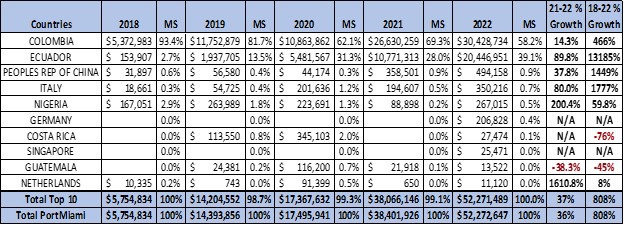 Het merendeel van de bloemen die de VS importeren, kwam in 2022 uit twee landen, namelijk Ecuador (43% in termen van TEU's) en Colombia (39%). Ook het gros van de bloemen die in PortMiami aankomen, zijn afkomstig uit deze twee landen. Colombia staat in voor 55% van de aanvoer en Ecuador voor 42%. In waarde gaat het om $ 30,5 miljoen uit Colombia en $ 20,5 miljoen uit Ecuador. De grootste bedrijven die bloemen importeren via PortMiami hebben de expertise in huis om bloemen te behandelen en ze beschikken over ultramoderne koelmagazijnen om de toenemende hoeveelheden te verwerken.