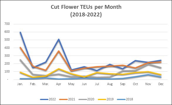 De afgelopen vijf jaar is het aantal TEU's (equivalent van 20-voets container) voor de import van bloemen drastisch toegenomen, van 254 stuks in 2018 naar 2.908 stuks in 2022. De grootste stijging vond plaats in de eerste drie jaar. In 2021 bedroeg het aantal TEU's 2.407. PortMiami ontving voor $ 52,3 miljoen aan snijbloemen in 2022, een stijging van 14,3% ten opzichte van de $ 38,1 miljoen in 2021.