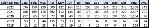 Bloemenimport via PortMiami per jaar/maand – 2018-2022 (TEU's)