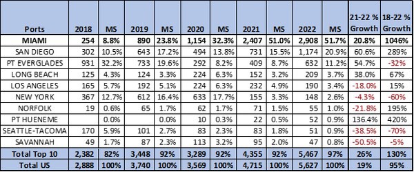 Met een aandeel van 52% in 2022 is PortMiami de belangrijkste maritieme bestemmingshaven voor snijbloemen in de Verenigde Staten (2.908 TEU's). Daarna volgt de haven van San Diego met 21% van alle bloemenimport.