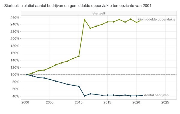 Onderstaande figuur geeft de evolutie weer van het aantal bedrijven met sierteelt en de gemiddelde oppervlakte sierteelt per bedrijf. Deze evolutie wordt weergegeven als een index ten opzichte van 2001. De absolute cijfers zijn beschikbaar op het platform.