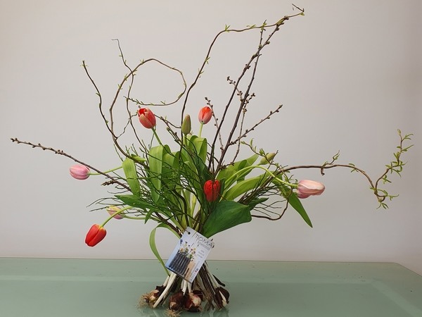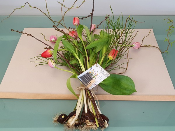 Tholen - Daar zijn ze weer: de biologische tulpenboeketten met de bol er nog aan. TOMA Bloemenervice maakt deze bijzondere bio-boeketten al een aantal jaar. "De bollen heb ik het afgelopen jaar bij John Huiberts ingekocht en zelf in onze koude kas gezet. Eerder kocht ik de tulpen in en nu hebben we dus voor het eerst eigen teelt", aldus Toma Smit.