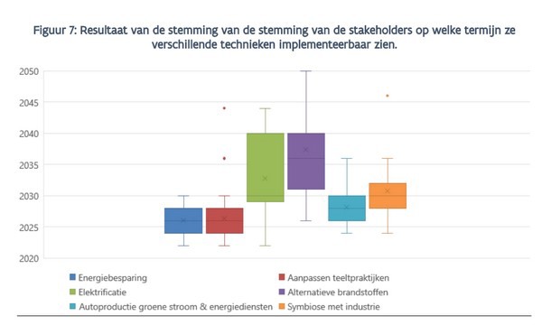 Op de middellange termijn zal symbiose met industrie of bronnen van restwarmte en CO2 waar mogelijk een belangrijke pijler zijn. Ook de mogelijkheden van meer digitalisatie/sensoren, slimme algoritmes en artificiële intelligentie kunnen in de komende jaren een rol spelen om het maximale potentieel te halen uit energiebesparende maatregelen.