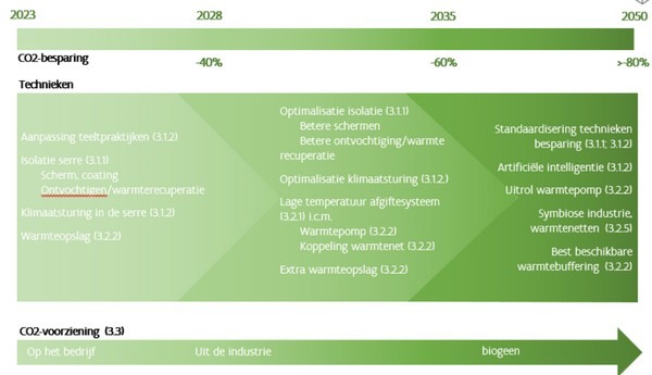 De tuinbouwsector kan inzetten op restwarmtenetten, warmtepompen, afgiftesystemen en er kan meer aan warmteopslag worden gedaan. Op de lange termijn zouden deze technieken de nieuwe standaard moeten worden. Elektrificatie en de invulling van de CO2-bron zijn belangrijk te volgen lijnen. Een combinatie van de verschillende energiebesparende maatregelen die hierboven beschreven staan, zou kunnen leiden tot 'bijna klimaatneutraliteit'.
