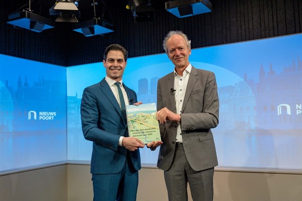 Minister Jetten (links) met het rapport 'Energie door perspectief: rechtvaardig, robuust en duurzaam naar 2050'