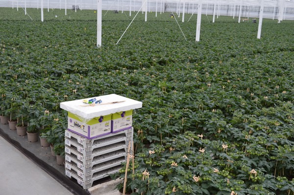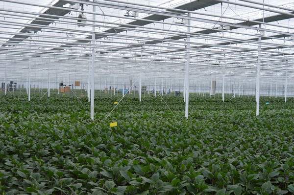 Aubergineplanten in een van de nieuwere kassen