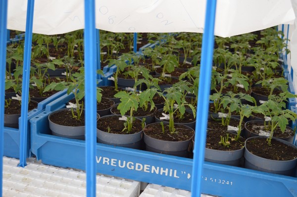 Potatom. Onderin de plant is een klemmetje te zien, daar is de tomaat op de aardappel geënt.