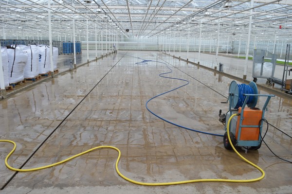 Komkommerplanten krijgen water. Staat het zonnetje erop dan kunnen ze tot wel 10 cm per dag groeien. Om ervoor te zorgen dat dit 'ordelijk' gebeurt komen er de nodige stokjes en klemmetjes aan te pas en moeten medewerkers geregeld door het gewas gaan.