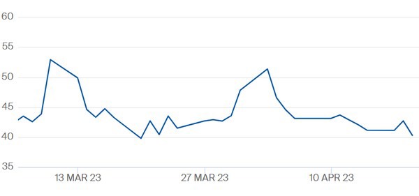 TTF-gasprijs meicontract t/m 19 april 2023. Klik hier voor vergroting en actuele cijfers. Als gevolg van lage temperaturen voor de tijd van het jaar ligt de spotprijs op de TTF-gasmarkt nog iets lager dan het meicontract.