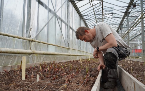 Danny van Eijk bij de teeltbakken met Cyrtanthus. ,,Volgens mij zijn wij het enige bedrijf in Nederland dat deze teelt professioneel heeft opgepakt. Voorlopig is het allemaal nog op proefschaal, maar we willen er zeker verder mee.’’