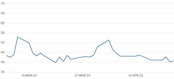 TTF-gasprijs meicontract t/m 20 april 2023. Klik hier voor vergroting en actuele cijfers.