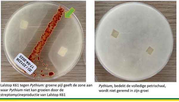 Aan de rechterkant in onderstaande afbeelding is een petrischaal vol met Pythium te zien, aan de linkerkant een petrischaal waar preventief Lalstop K61 is toegepast. In de rechter petrischaal is te zien dat de Pythium zich over de volledige petrischaal ontwikkeld heeft (een grote witte waas). In de linker petrischaal is te zien dat de preventieve toepassing van Lalstop K61 duidelijk de ontwikkeling van Pythium remt. De groene pijl geeft de Pythium-vrije zone aan. Wanneer Lalstop K61 preventief op de wortels van uw gewas aanwezig is, zorgt het daar voor een vergelijkbare Pythium-vrije zone.