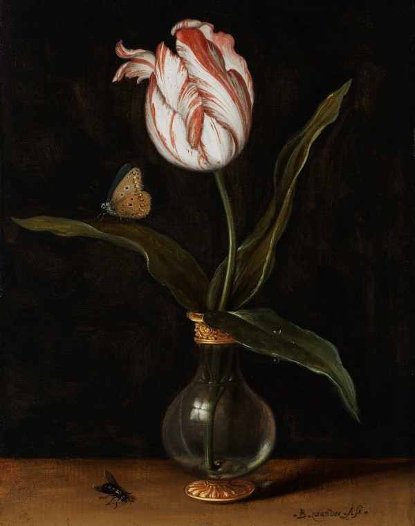 Op de recente aanwinst is een rood-wit gekleurde tulp te zien. In de 17de eeuw waren deze ‘gebroken’ tulpen met gevlamde bloembladeren het meest geliefd, de reden dat op schilderijen bijna nooit effen tulpen zijn afgebeeld. Wat men toen alleen niet wist, is dat de ‘vlammen’ op de tulp het gevolg waren van een virusinfectie. Hierdoor kwam er niet elk jaar dezelfde tulp uit een bol. Op een van de bladeren zit een vlinder, een blauwtje, waarvan de binnen-vleugels goed te zien zijn met alle gele stippen. De vlinder vormt net als het vaasje het goudbruine kleuraccent in de voorstelling. Aan de andere kant naast het vaasje zit een dikke bromvlieg. Waar de vlinder vaak symbool staat voor vernieuwing en reïncarnatie, verwijst de bromvlieg naar dood en verval. Waarschijnlijk een bewuste keuze van de schilder om twee uitersten te verwerken in een klein en sympathiek schilderij. De vlieg wijst ons op het onvermijdelijke verwelken van de tulp, maar de vlinder biedt ons hoop. Elk jaar bloeit er namelijk weer een nieuwe bloem uit de tulpenbol.