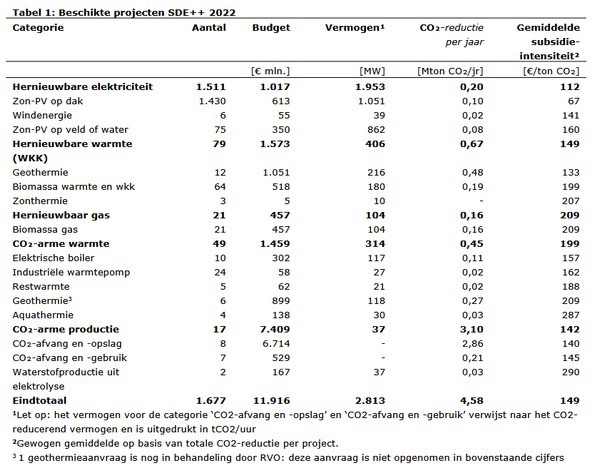 Daarnaast is er ruim € 3 miljard toegekend aan hernieuwbare en CO2-arme warmte, zoals geothermieprojecten, en € 1 miljard voor hernieuwbare elektriciteit. SDE-subsidie uit de pot in 2022 ging naar 18 projecten, waaronder 12 nieuwe projecten en 6 herindieningen.