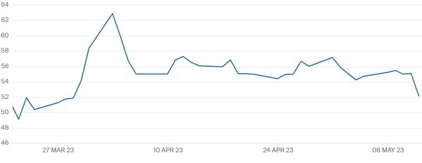 De TTF-gasprijs voor een contract 'winter 2023' t/m vrijdag 12 mei. Maandagochtend 15 mei ligt de prijs op op 49,6 euro per megawattuur. Klik hier voor vergroting en de meest actuele cijfers.