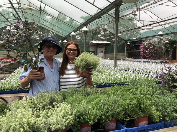 David Magal, Initiatives & Commerce bij Hishtil (met Ocimum basilicum 'Magic Mountain') en Elina Harazi, verkoopcoördinator (met Thymus spp. 'Sparkling Bright').