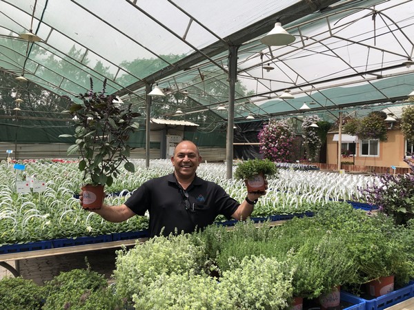 Haim Rosenblum van de marketing- en verkoopafdeling, die hier Ocimum basilicum 'Magic Mountain' en Thymus citriodorus 'GrowFlow' Lemonade' toont.