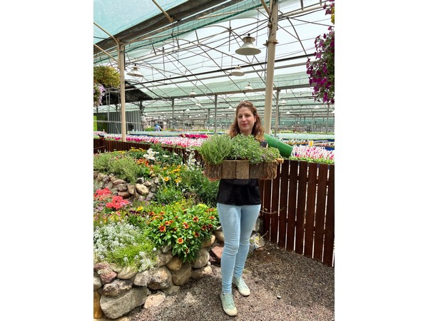 Zehavit Wolf (Deputy Marketing Manager & Events Specialist) toont Hesperozygis satureja' Midnight Mojito,' Thymus citriodorus 'GrowFlow' Lemonade,' Thymus vulgaris' Compactus.'