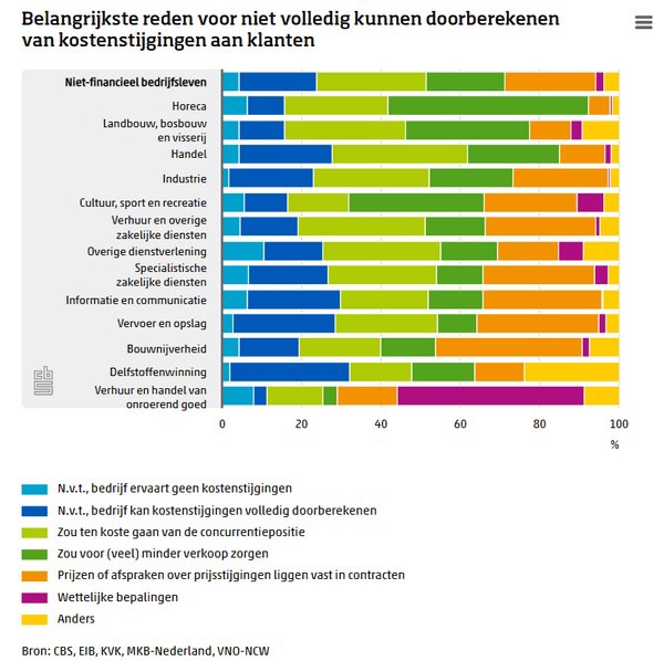 Ook is er een groot deel van de bedrijven (23 procent) dat aangeeft dat prijzen of afspraken over prijsstijgingen vastliggen in contracten. Daardoor kunnen kostenstijgingen niet of deels worden doorberekend. Circa een kwart van de bedrijven geeft aan geen kostenstijgingen te ervaren of kan deze volledig doorberekenen.