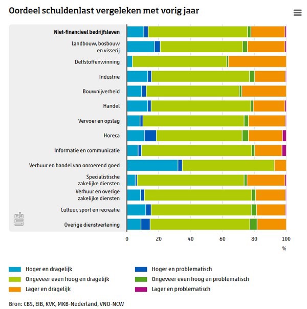 Vergeleken met andere sectoren is in de horeca en overige dienstverlening het percentage bedrijven dat de schuldenlast beoordeelt als problematisch, het grootst. In de horeca is de schuldenlast voor ruim 13 procent van de bedrijven problematisch. In de overige dienstverlening geldt dit voor ruim 10 procent van de bedrijven.