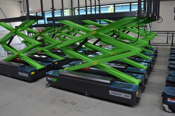 Greenlift 3000: de hydraulische schaarwagen uitgevoerd met twee middenwielen i.c.m. twee zwenkwielen.