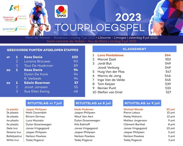 De gele trui is in Frankrijk nog altijd voor Jonas Vingegaard, al komt zijn Sloveense belager Tadej Pogačar wel steeds dichterbij. Ten opzichte van vrijdag hebben we in het Takii Tourploegspel wel een nieuwe winnaar. Het is de deelnemer met de naam Loco Pantalones. Wie weet wel de collega die vandaag met een grote glimlach naast u achter de computer, inpakband of op de buisrailkar staat?