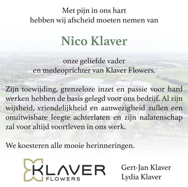 Met pijn in ons hart hebben wij afscheid moeten nemen van Nico Klaver, onze geliefde vader en medeoprichter van Klaver Flowers.