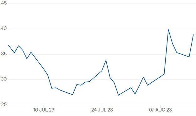 TTF-gasprijs contract 'september 2023' t/m 15 augustus 2023. Klik hier voor vergroting en de meest actuele cijfers.