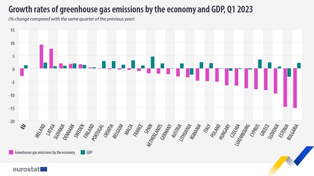 De broeikasgasemissie van de EU-economie daalde in het eerste kwartaal van 2023 met 2,9% ten opzichte van hetzelfde kwartaal in 2022 becijfert Eurostat.