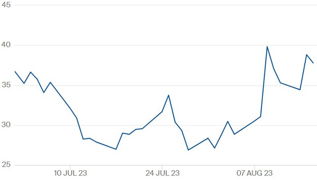 TTF-gasprijs contract 'september 2023' t/m 16 augustus 2023. Klik hier voor vergroting en de meest actuele cijfers.